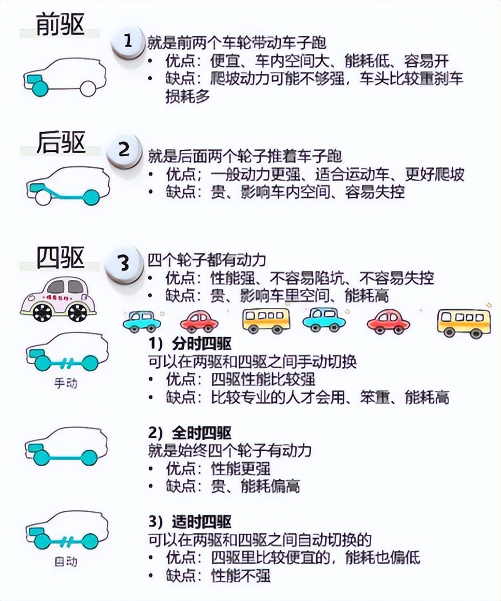 1.主要用来干嘛?日常通勤、家用选前驱;追求操控、喜欢开车选后驱;雨天雪天多、偶尔走烂路选适时四驱;常跑高速、要稳定性选全时四驱;专门越野选分时四驱。